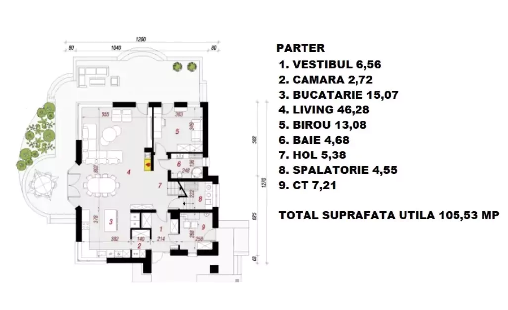 Plan PARTER. Nu ai cum sa nu observi din prima secunda in care privesti planul parterului faptul ca exista o zona de zi imensa. Doar zona de living room, in care este integrata si zona de dinning, are 46 mp. Daca mai adaugam si suprafata bucatariei open space de 15 mp vom obtine peste 60 mp de zona de petrecut timpul alaturi de familie si prieteni. Si, ca sa fie totul perfect, din living room poti sa iesi pe doua terase exterioare super interesante si util, de unde poti sa te bucuri din plin de frumusetea casei tale dar si de curte si imprejurimi. Un birou de 13 mp ce poate fi folosit si ca dormitor de oaspeti se afla in imediata apropiere a livingului. O baie de aproape 5 mp deserveste intregul parter.