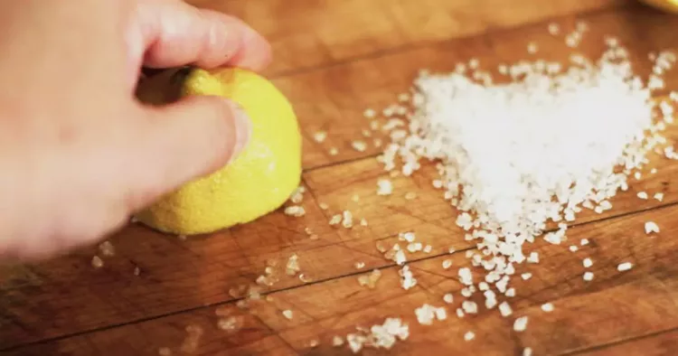 Cealalta jumatate de lamaie foloseste-o ca pe un burete cu care sa cureti suprafata tocatorului. Insista in zonele in care s-au format pete de-a lungul timpului.
